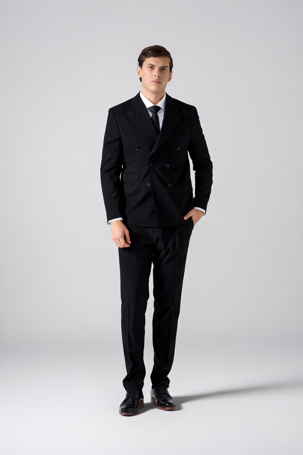 Ambo de calce Slim Fit, confeccionado en tejido de alpaca con spandex, que ofrece elasticidad controlada, excelente caída y textura suave. El saco cruzado, de líneas modernas y entalle preciso, aporta una silueta elegante y contemporánea. El pantalón sin pinza complementa el conjunto con un diseño limpio y estilizado.