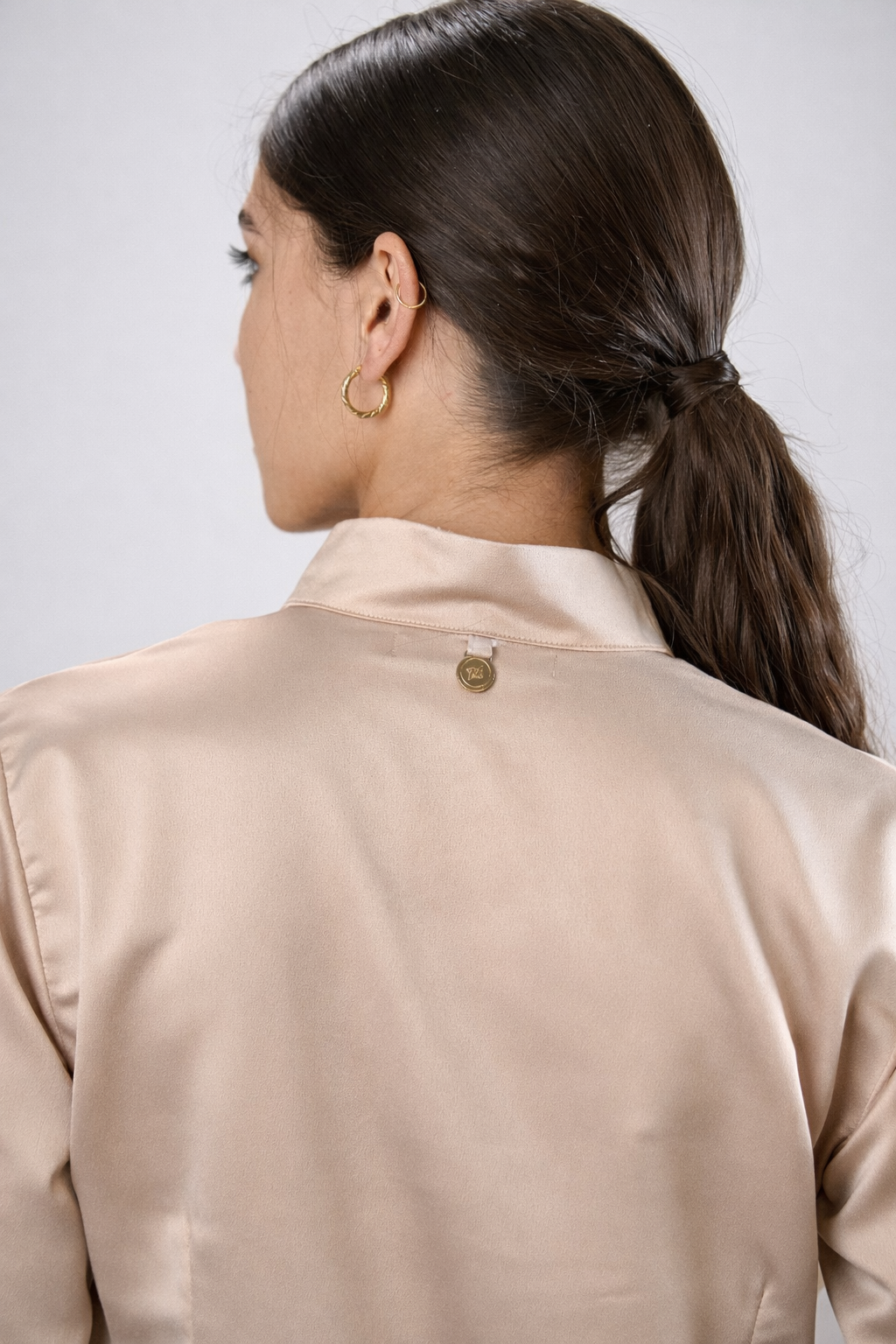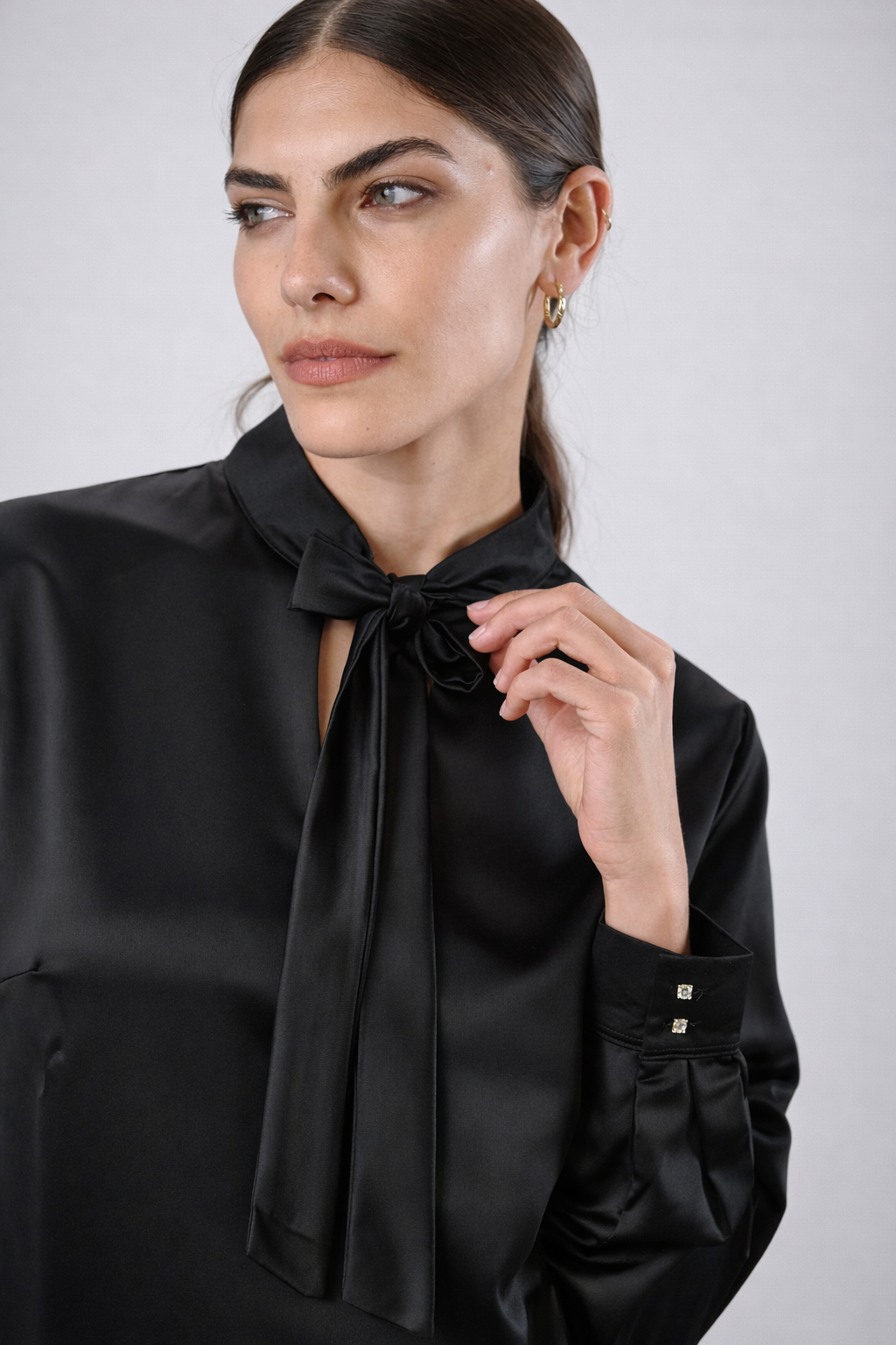 Blusa de estética refinada y diseño delicado, confeccionada en seda de textura suave y caída fluida. Presenta lazo en el cuello y manga larga, aportando un detalle femenino y sofisticado que realza la prenda con elegancia sutil. Ideal para looks formales o urbanos con impronta clásica y contemporánea.