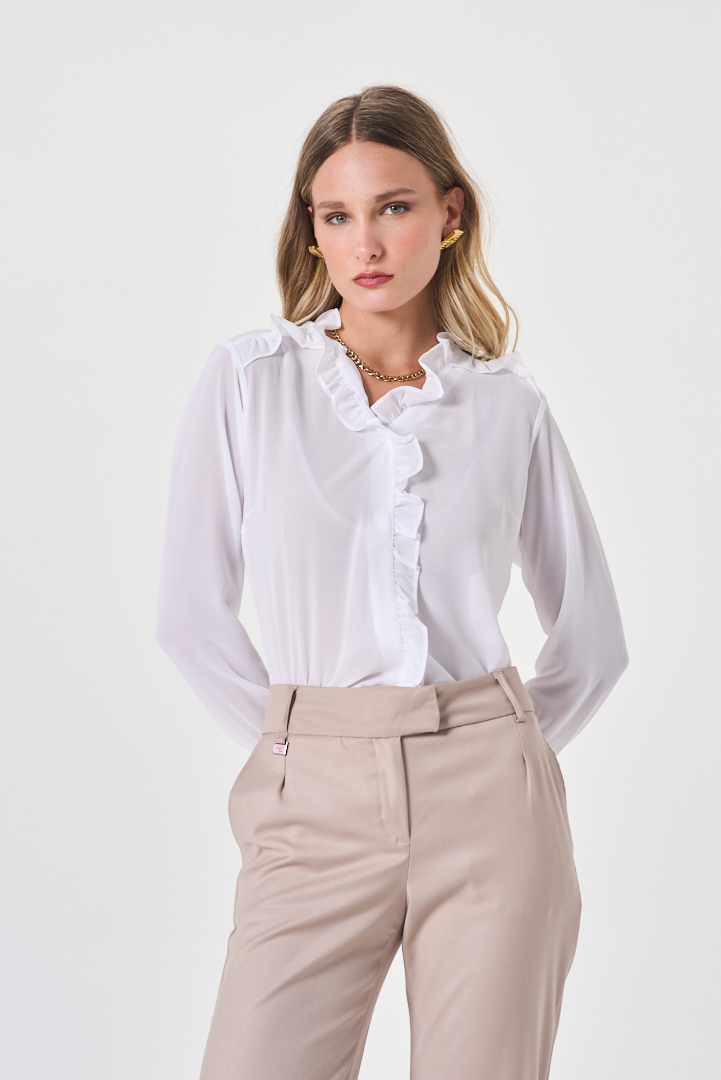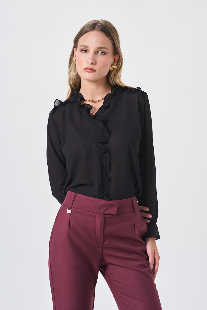 Blusa de estética delicada y diseño sofisticado, confeccionada en crepé de caída fluida y tacto suave. Presenta volados en el escote y canesú que aportan movimiento y un detalle femenino sutil, realzando la silueta con equilibrio y elegancia. Ideal para looks urbanos refinados o propuestas más formales con impronta atemporal.