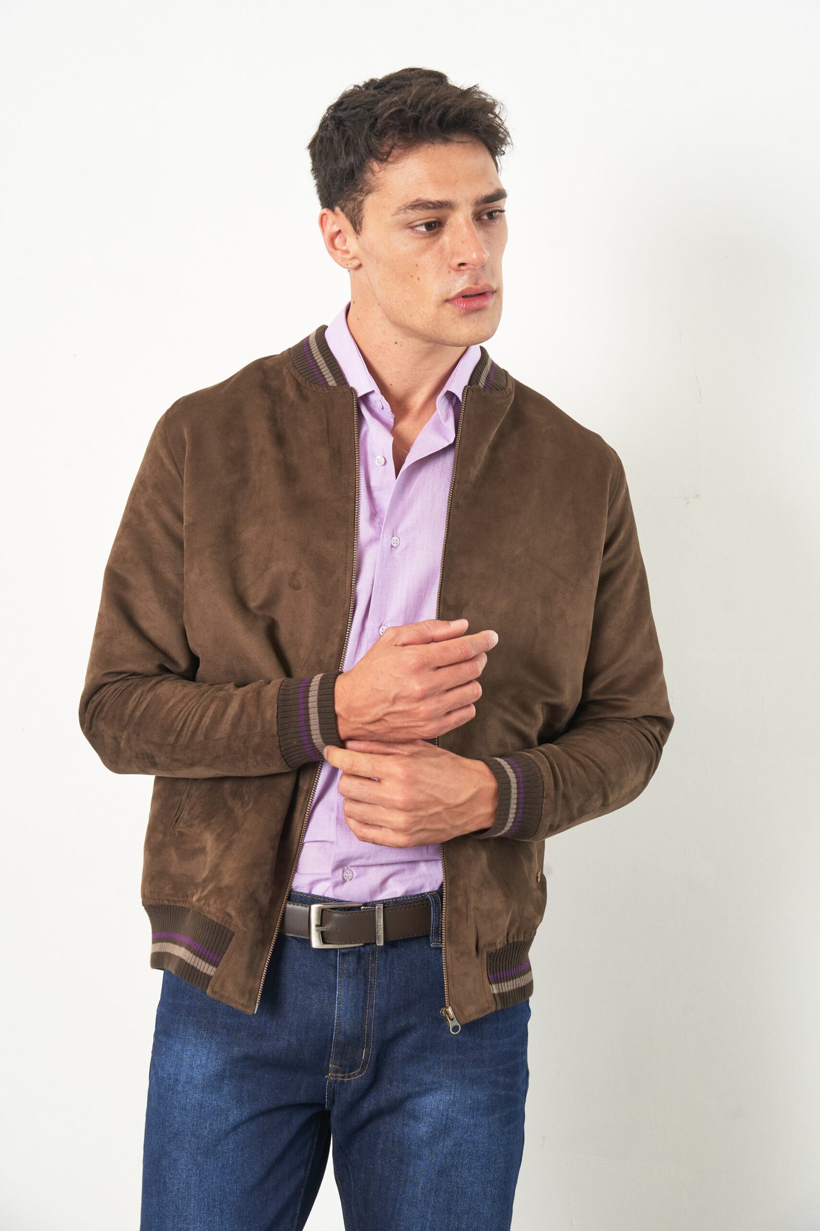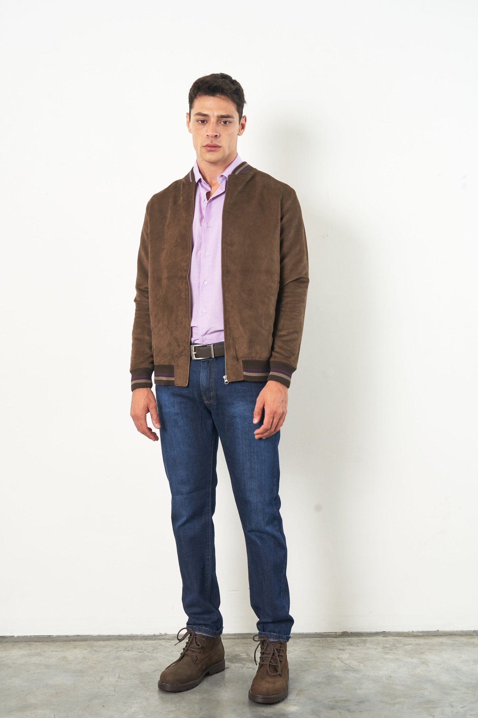 Campera bomber confeccionada en suade, de textura suave. Presenta puños y cintura tejidos que aportan ajuste, junto con bolsillos funcionales que suman practicidad. Una prenda urbana y contemporánea. El modelo mide 1,86 mts y está usando el talle L.