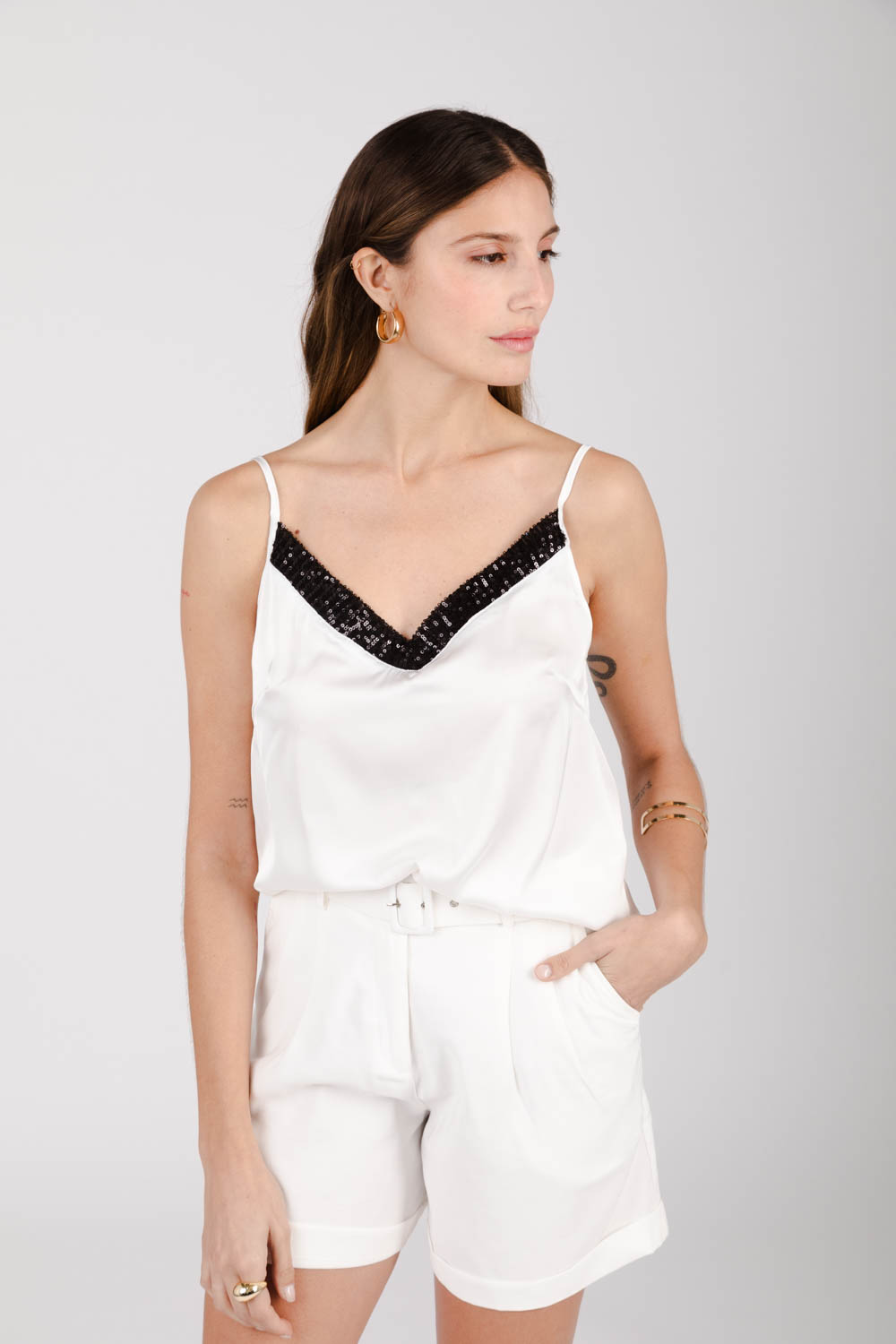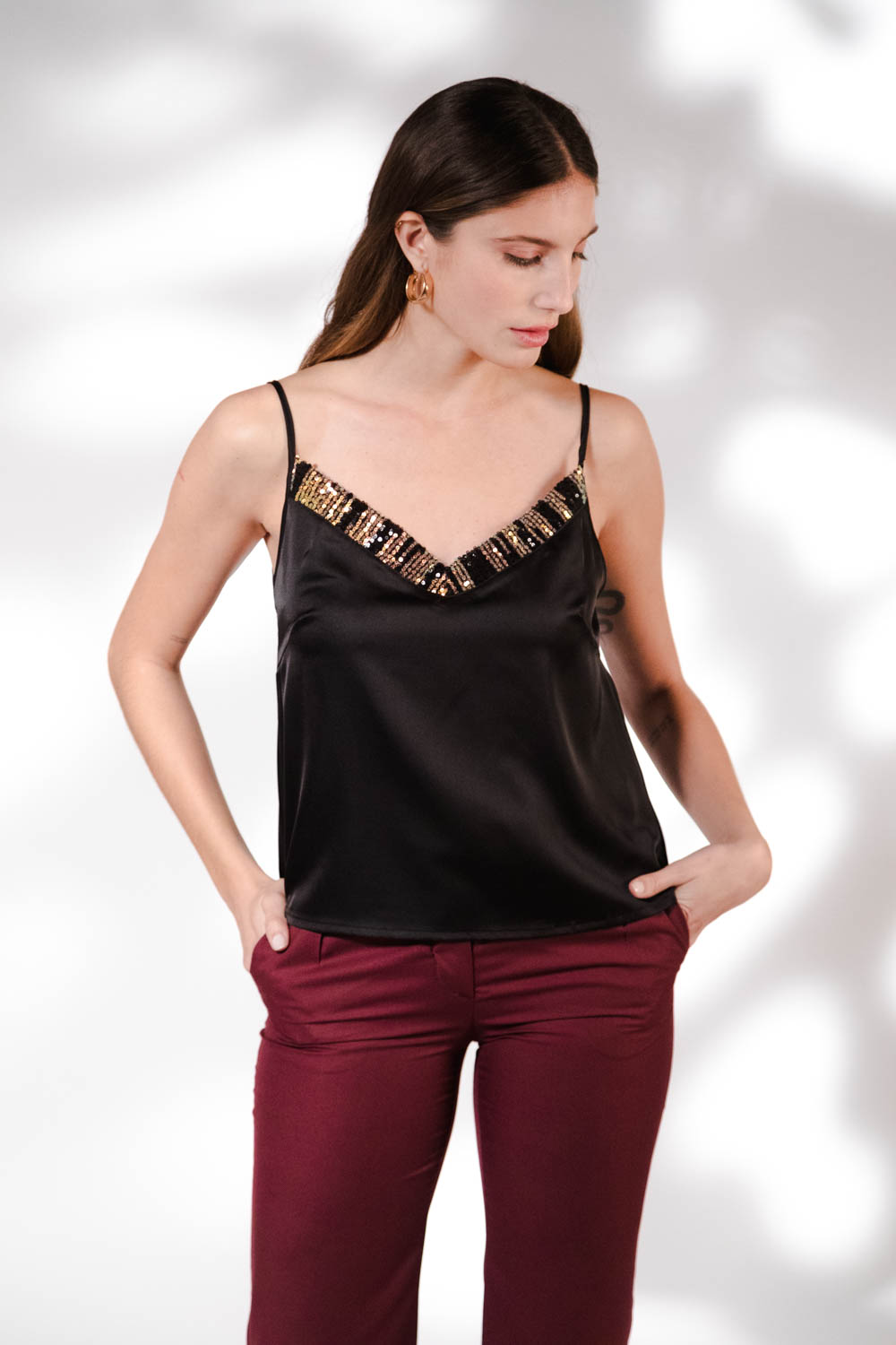 Bretelera noche con recorte de lentejuelas en el busto .