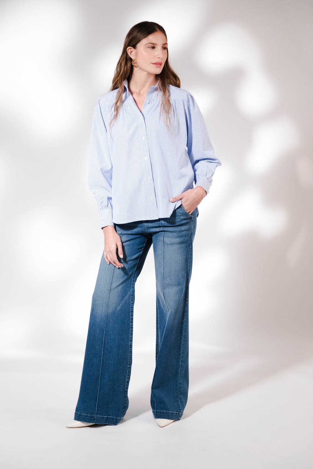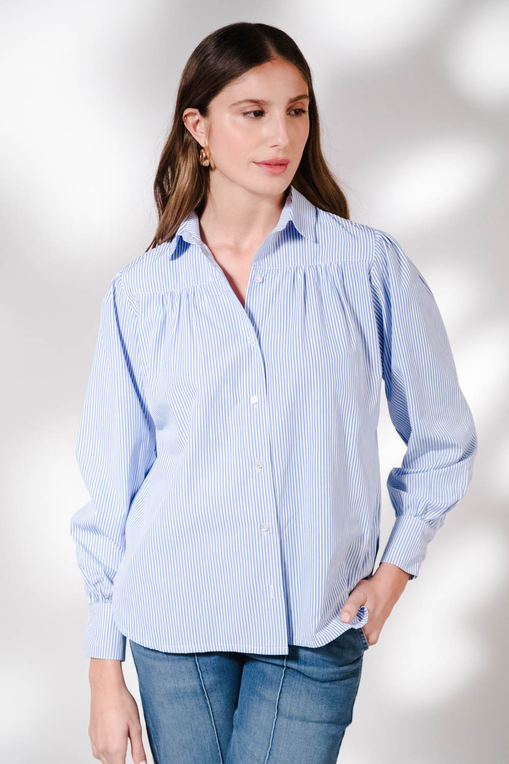 Camisa manga larga rayada con canesú drapeado .