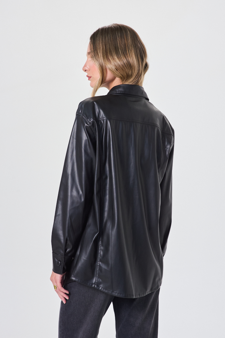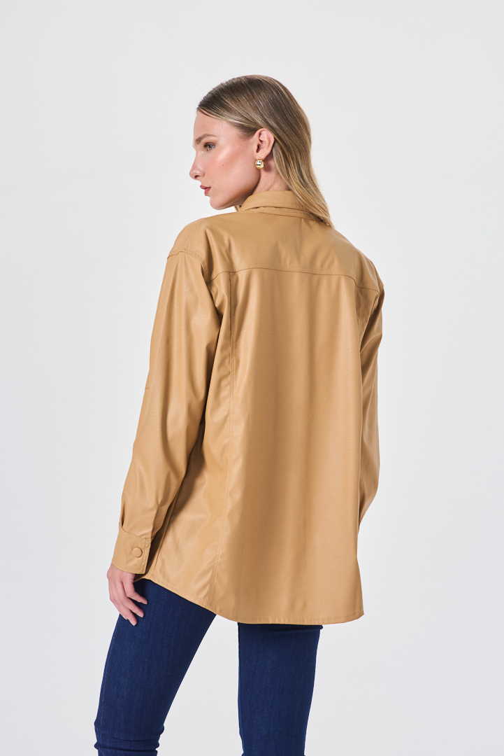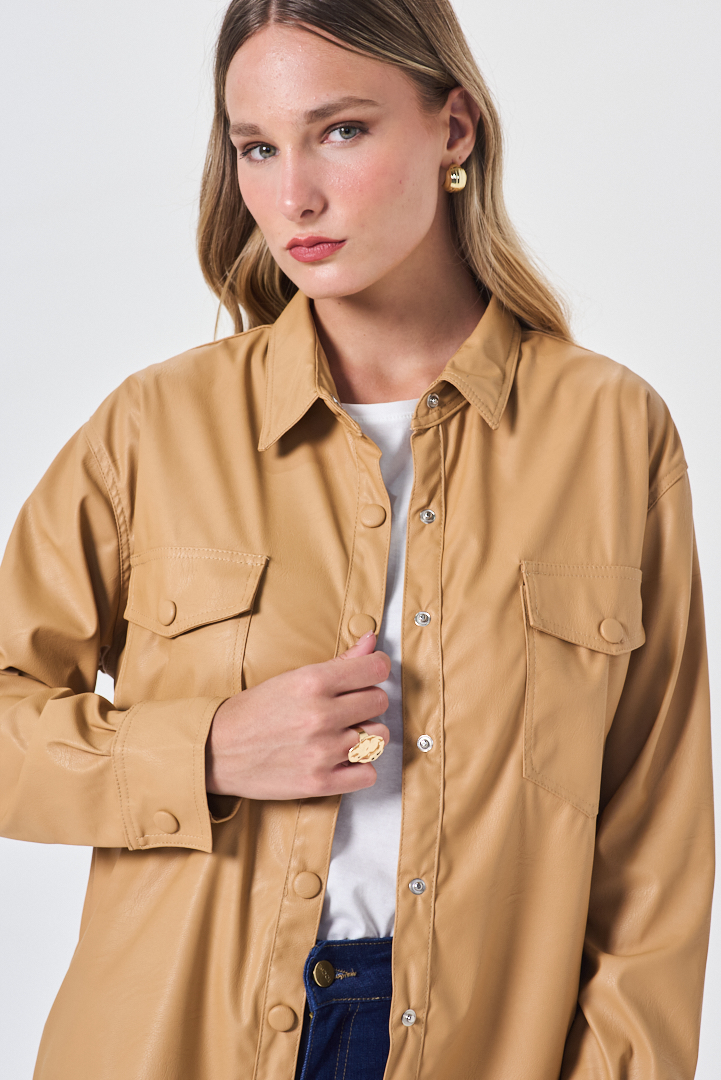 Camisa de estética contemporánea y diseño depurado, confeccionada en PU de textura suave y acabado elegante. Incorpora bolsillos frontales y broches forrados que aportan un detalle distintivo y refinado, logrando un equilibrio entre carácter moderno y elegancia urbana. Ideal para looks actuales con impronta atemporal.