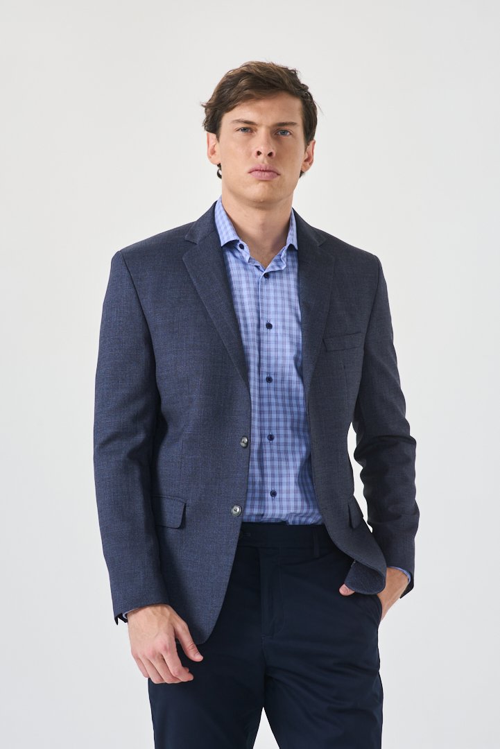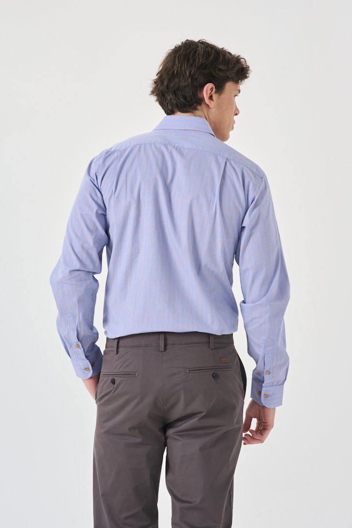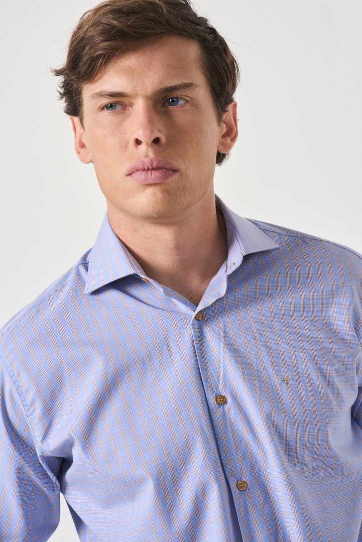 Camisa de vestir confeccionada en 100% algodón, con diseño fantasía sutil que aporta carácter y sofisticación. Su calce es slim fit. El modelo mide 1,89 mts y está usando el talle 42.