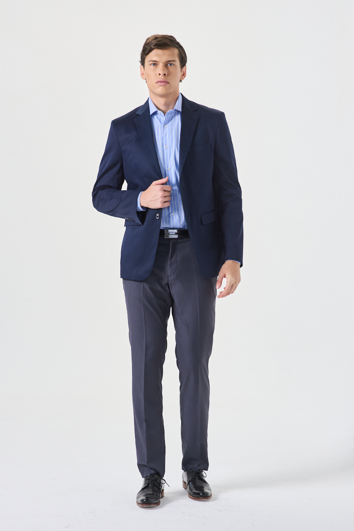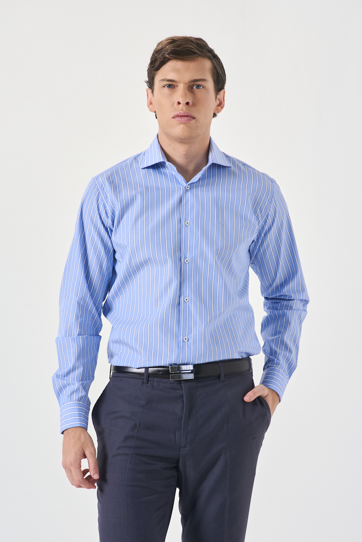 Camisa de vestir confeccionada en 100% algodón de alta calidad, con diseño de raya combinada que aporta contraste sutil y elegancia contemporánea. Presenta una caída prolija y refinada, ideal para un look formal moderno.