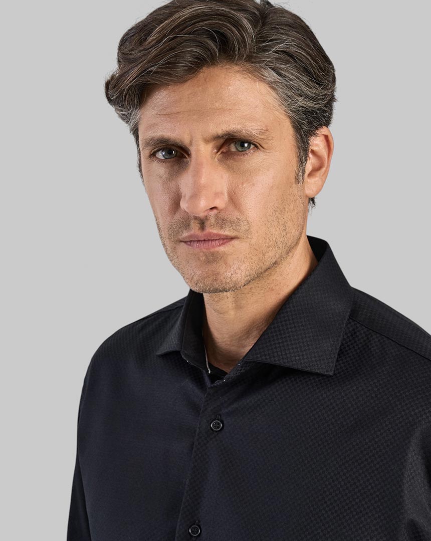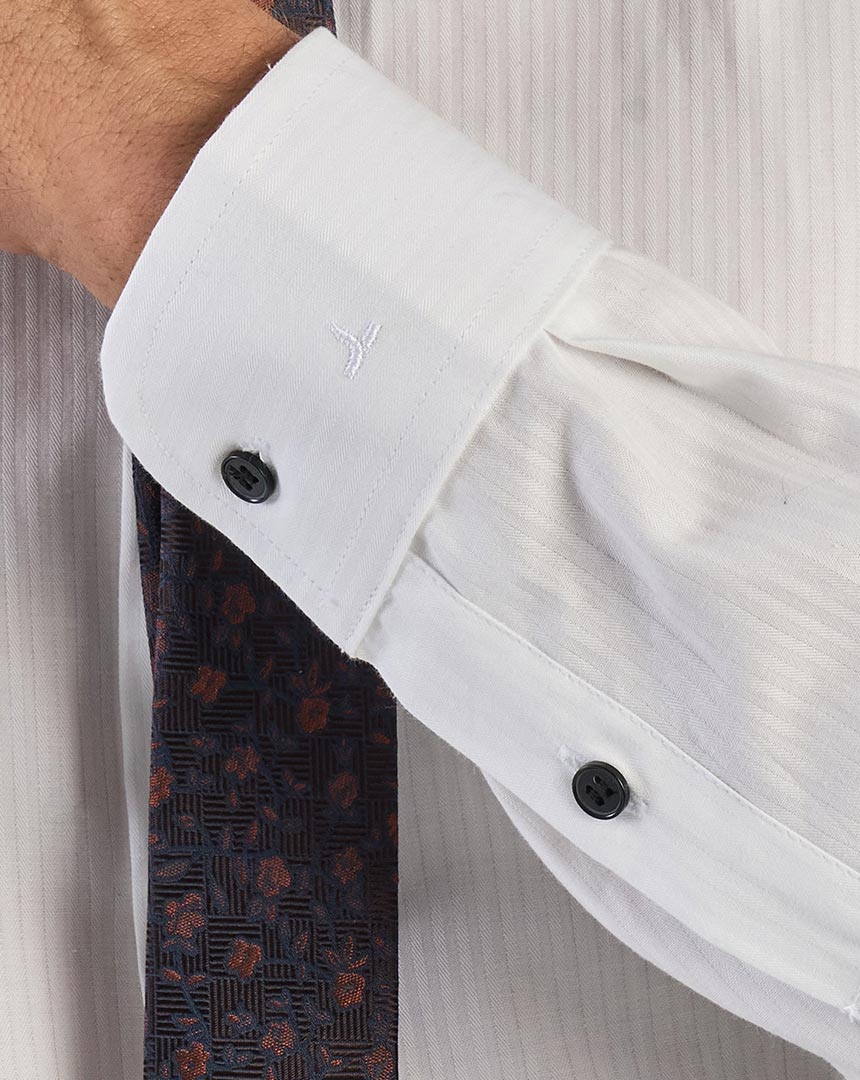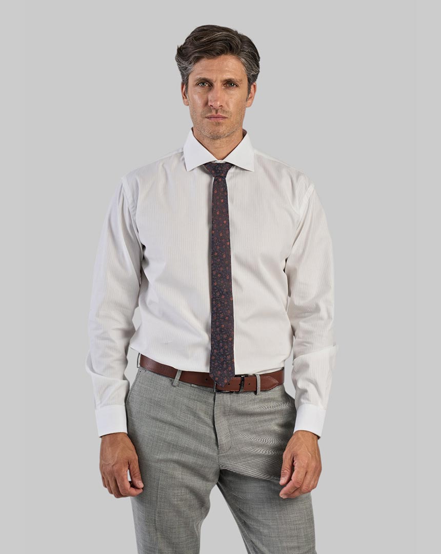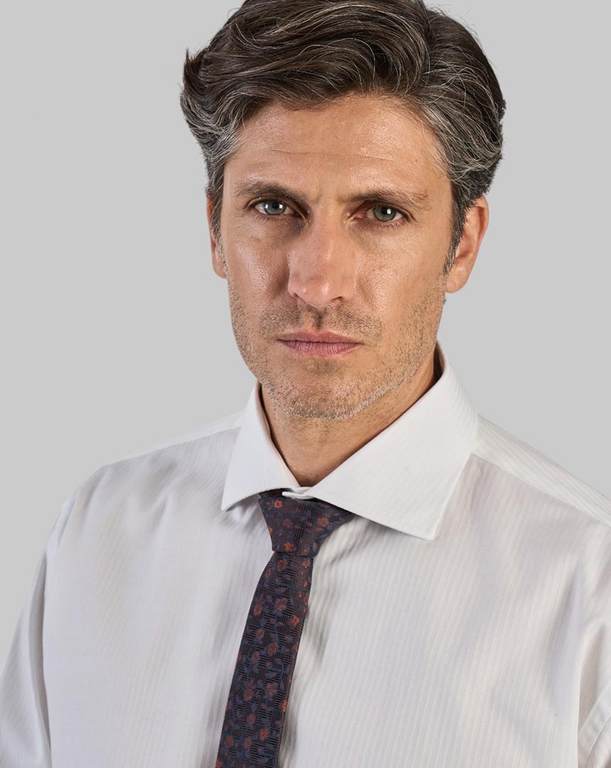 Camisa de vestir confeccionada en 100% algodón de alta calidad, con diseño fantasía ratier que aporta textura sutil y elegancia discreta. Su calce slim fit define la silueta con una caída limpia y sofisticada.