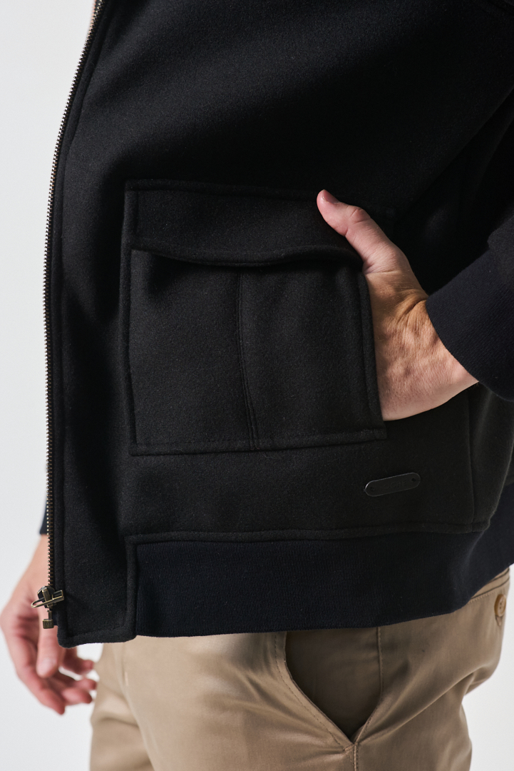 Campera bomber de estética contemporánea, confeccionada en paño liso de textura suave y caída estructurada. Presenta bolsillos plaqué y terminaciones en cintura y puños tejidos, que aportan definición a la silueta y un contraste sutil entre lo clásico y lo urbano. Una prenda versátil, pensada para looks de invierno modernos y refinados.