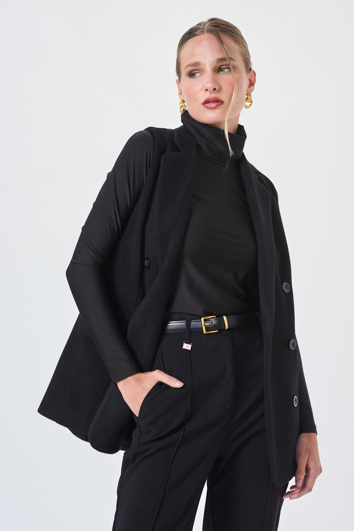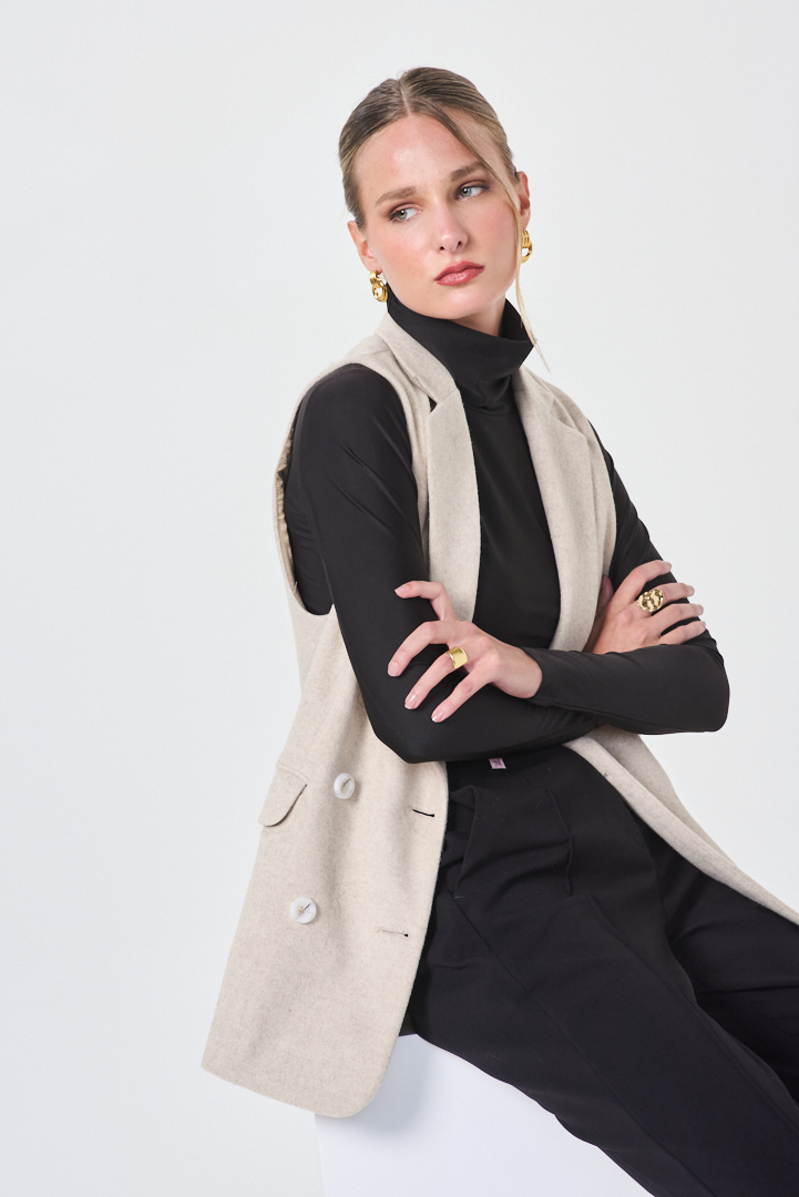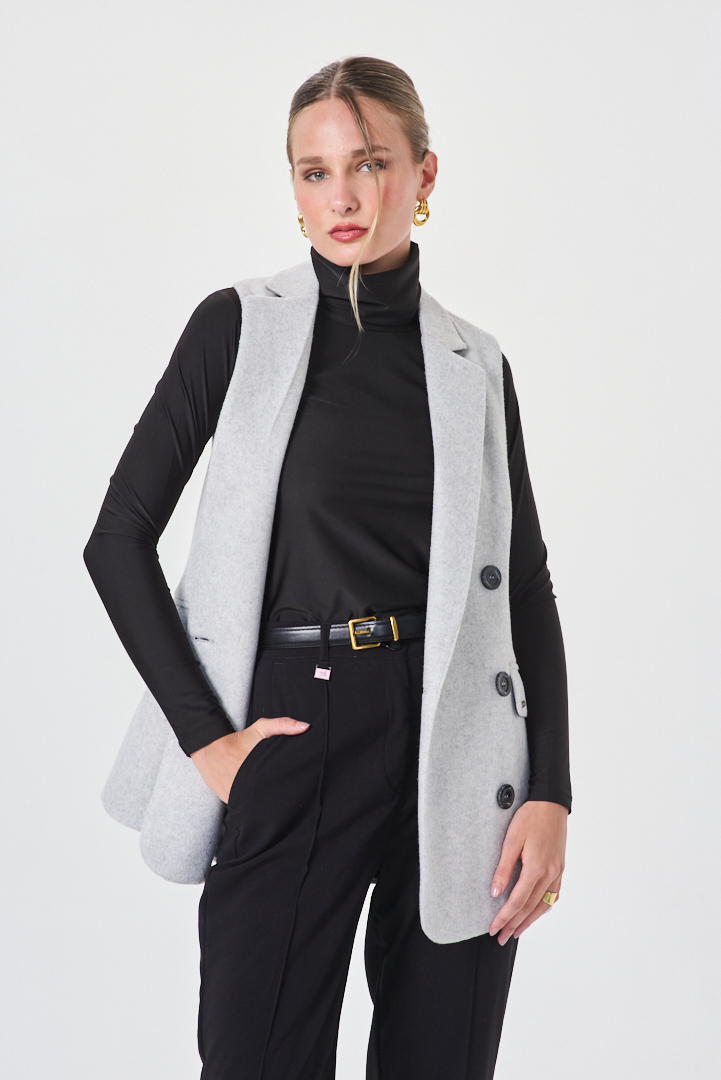 Chaleco de estética sastrera y diseño depurado, confeccionado en paño liso de textura suave y caída cuidada. Su silueta cruzada con botones aporta estructura y elegancia, logrando una prenda versátil ideal para completar looks formales o elevar conjuntos urbanos con una impronta atemporal.