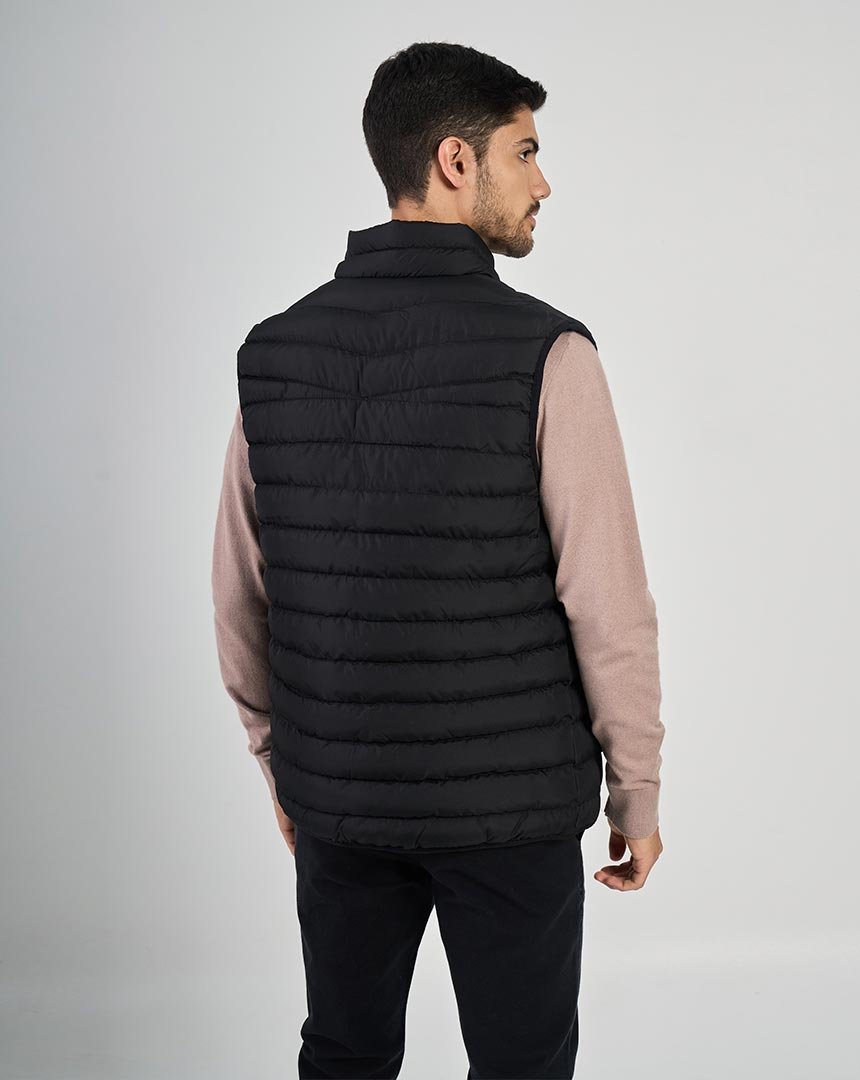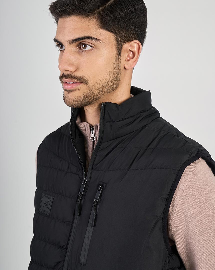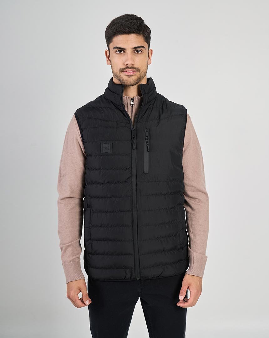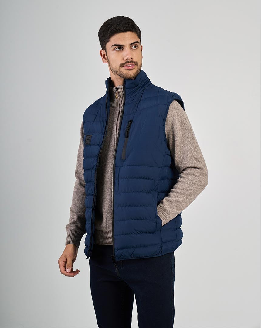 Chaleco confeccionado en matelassé . Ideal para superponer y elevar looks urbanos con un perfil sobrio y atemporal. El modelo mide 1,86 m y está usando talle M.