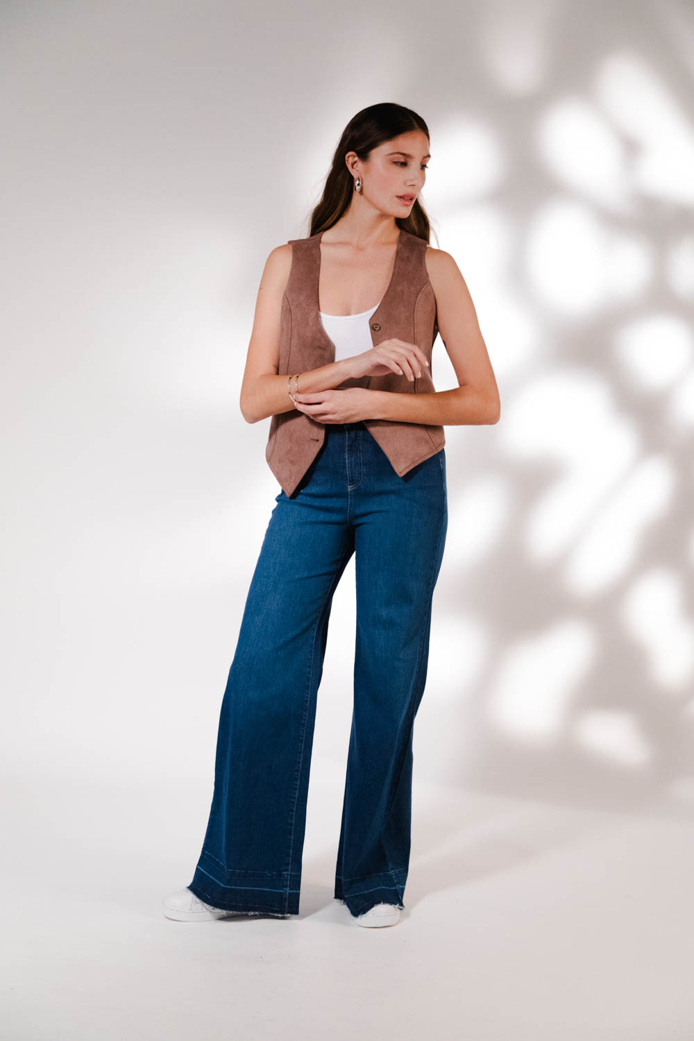 Pantalón denim 5 bolsillos. Wide leg tiro alto.