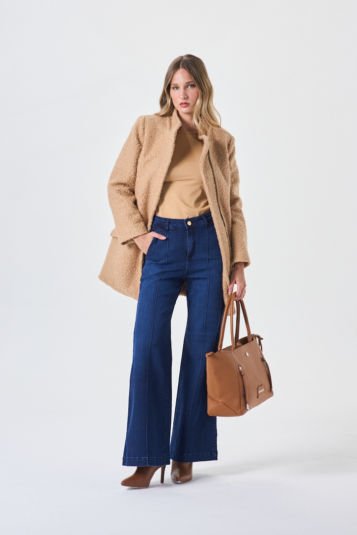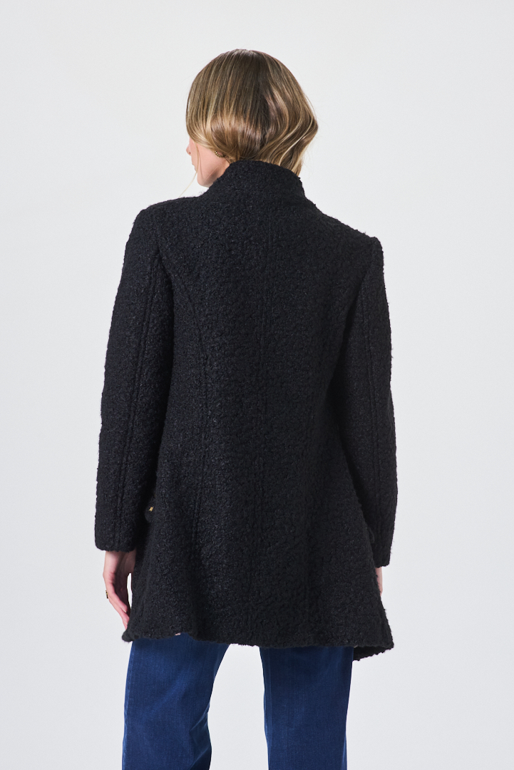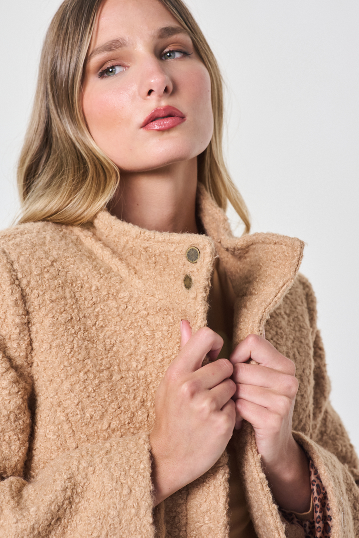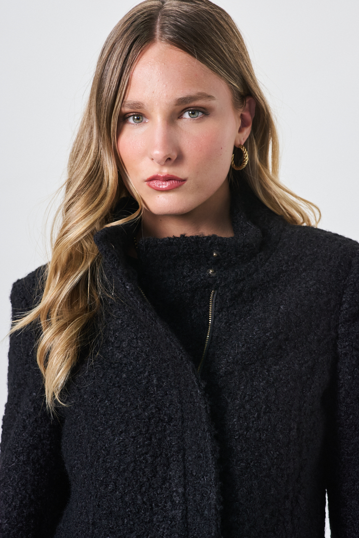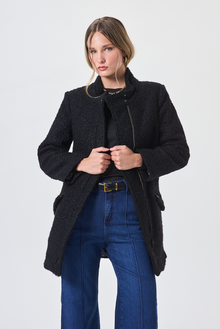 Gabán de estética sofisticada y diseño contemporáneo, confeccionado en paño bouclé que aporta textura y una presencia distintiva. Su interior forrado y cierre frontal combinan abrigo y funcionalidad, logrando una prenda equilibrada entre elegancia y confort. Ideal para looks urbanos refinados con impronta atemporal.