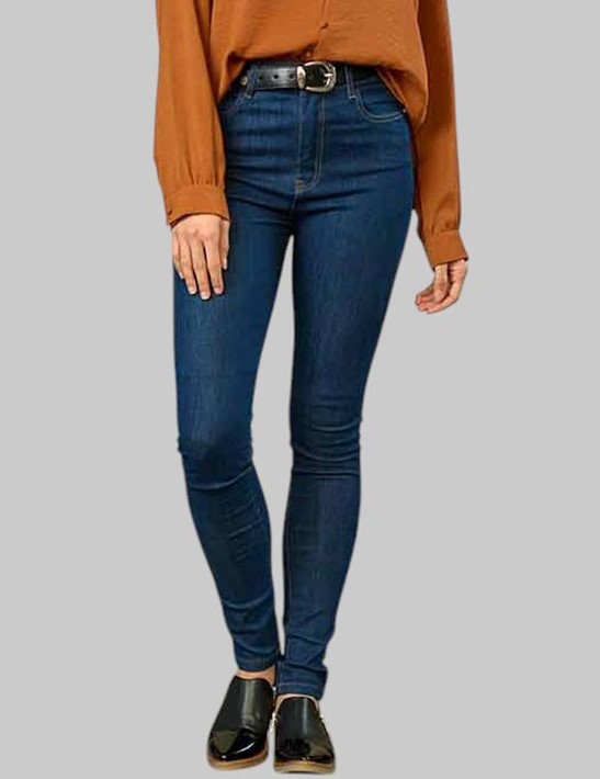 Jean chupín, strong blue denim, tiro alto. 5 Bolsillos. Con costuras.