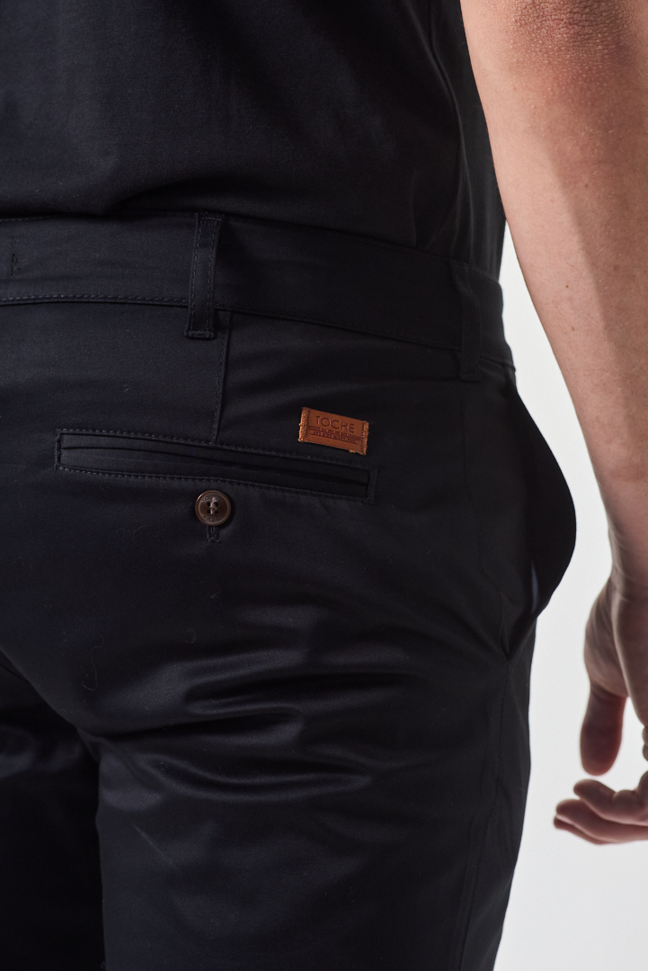 Pantalón semi formal de gabardina, algodón satén. Tiro medio, regular fit, sin pinza. Posee bolsillos laterales corte en diagonal, bolsillos traseros con dos vivos bordados con costura a tono y cierre metálico.