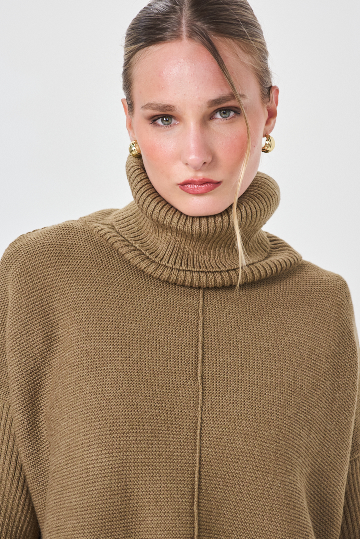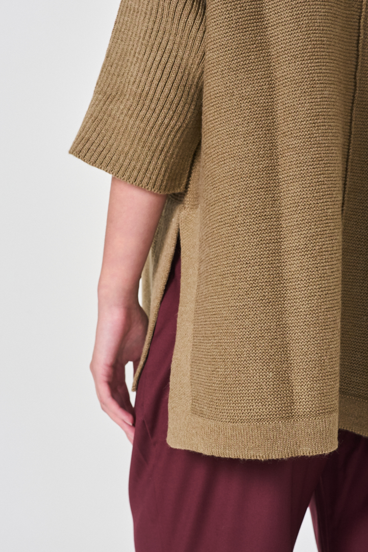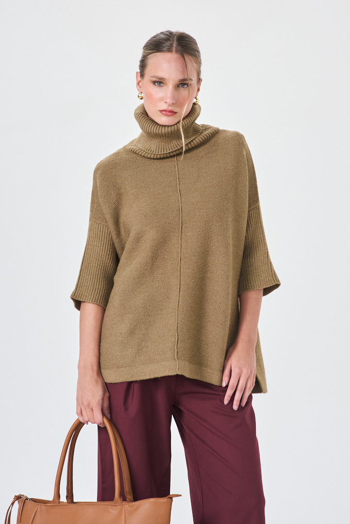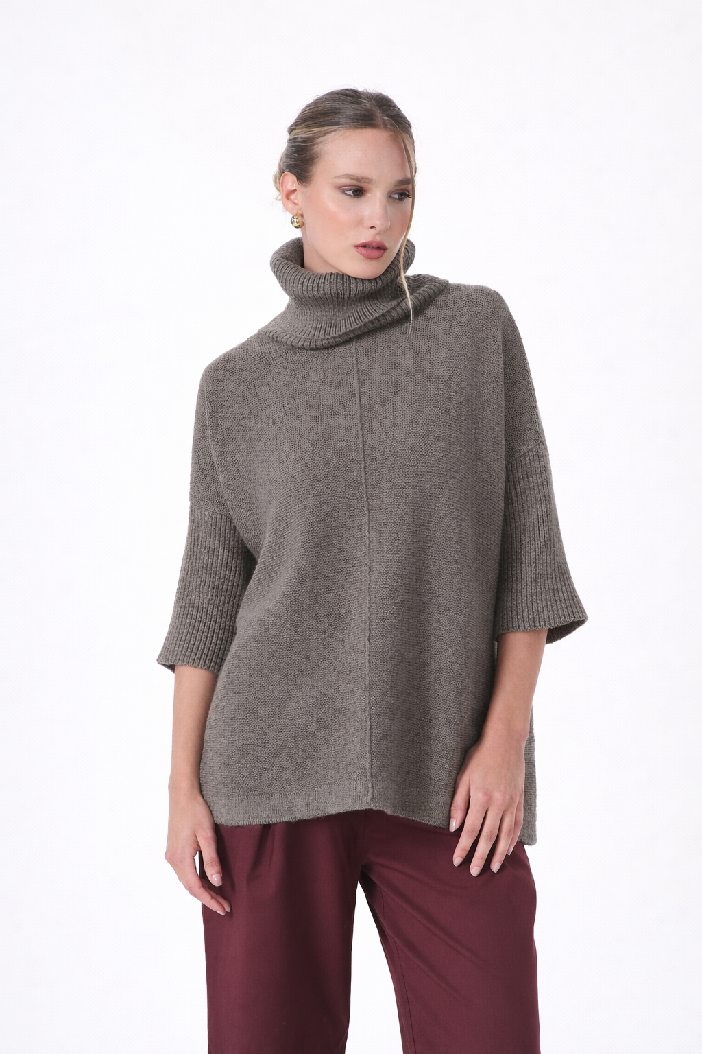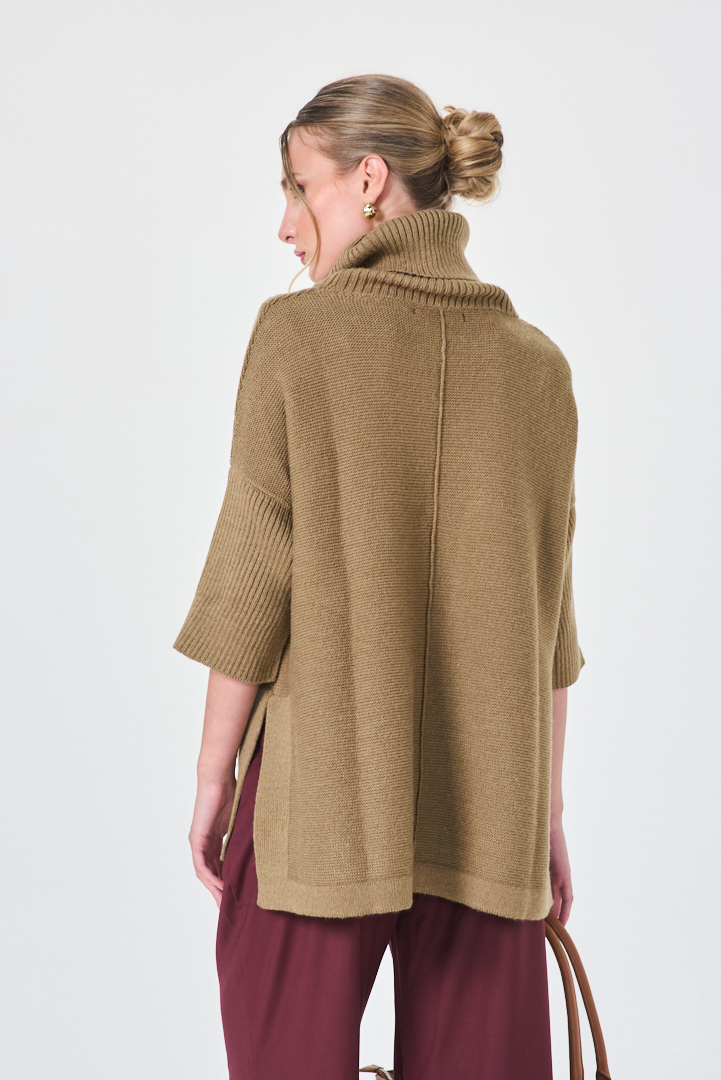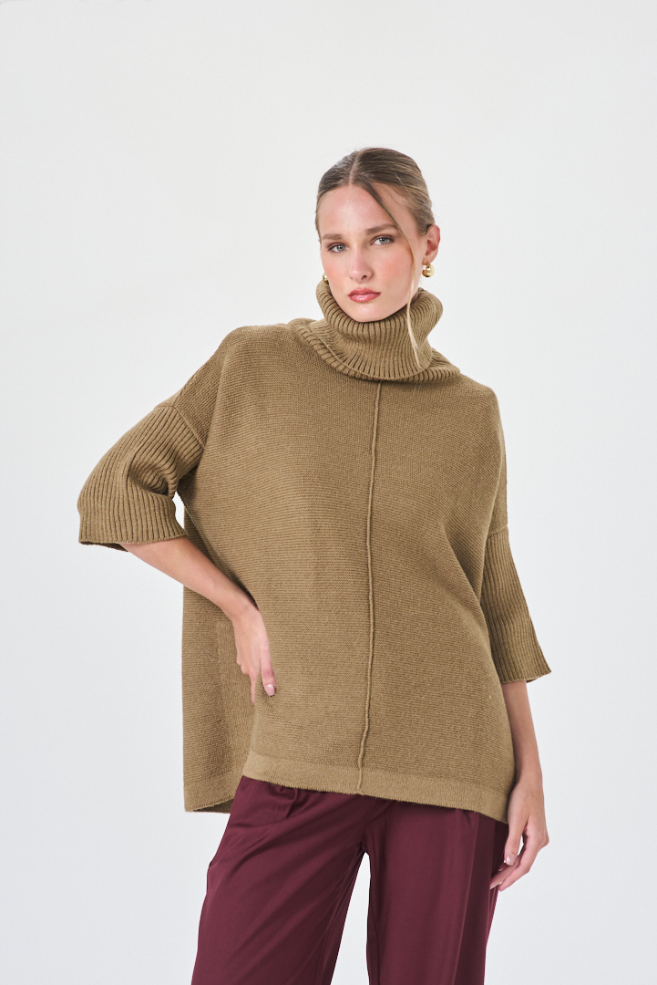 Poncho de estética contemporánea y diseño sofisticado, con cuello polera que aporta abrigo y una presencia elegante. Sus mangas 3/4 refuerzan una silueta fluida y equilibrada, ideal para superponer y elevar looks urbanos con una impronta moderna y atemporal.