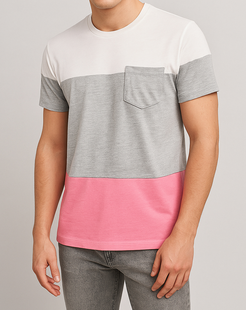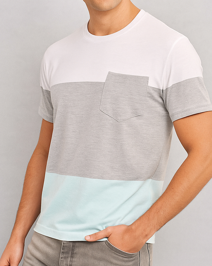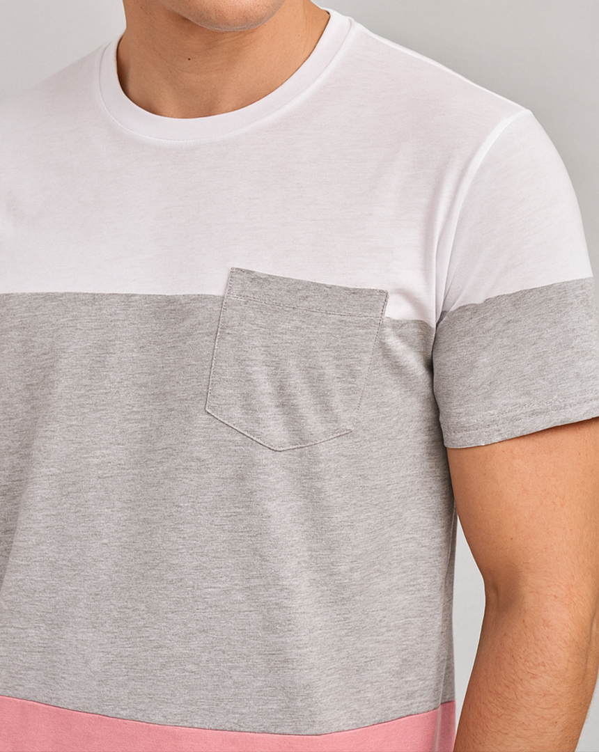 Remera  jersey escote redondo rayada manga corta con bolsillo.