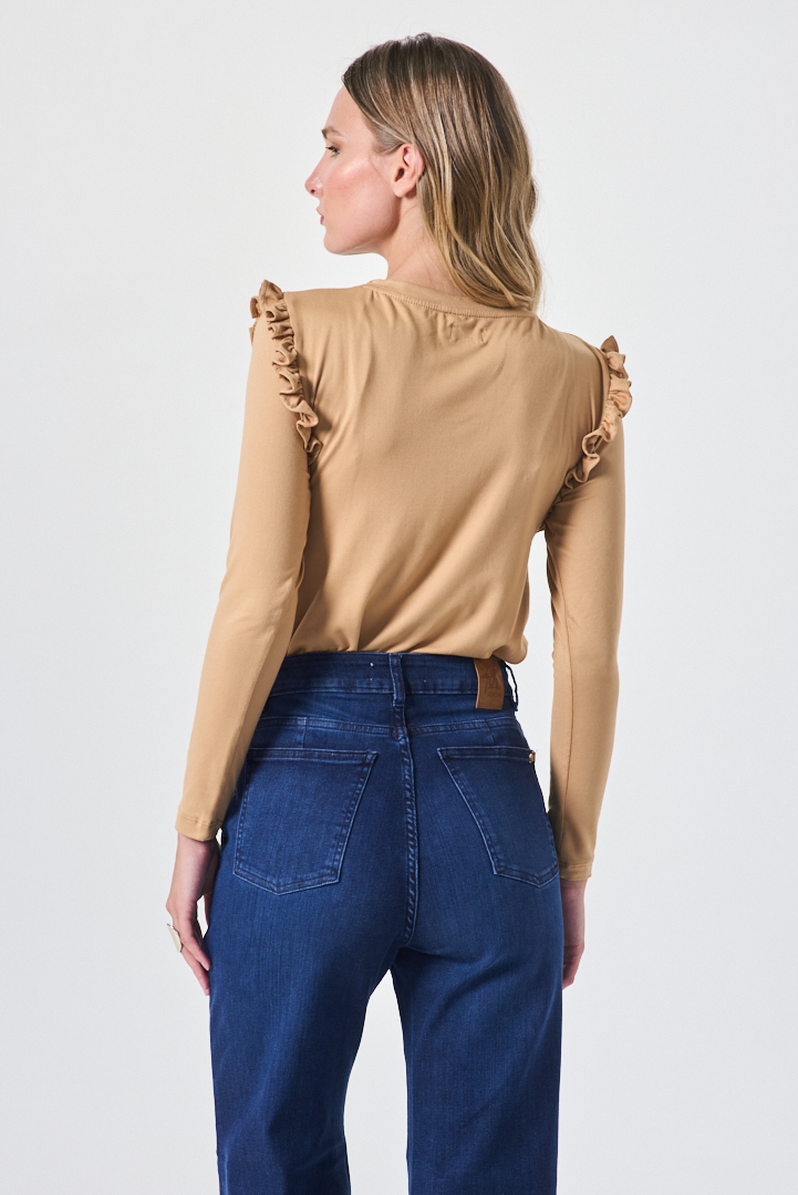 Remera de estética delicada y diseño femenino, con manga larga y escote redondo que aportan un perfil clásico y equilibrado. Incorpora volados como detalle distintivo, sumando movimiento y un toque sutil de sofisticación. Ideal para looks urbanos refinados con una impronta elegante y actual.