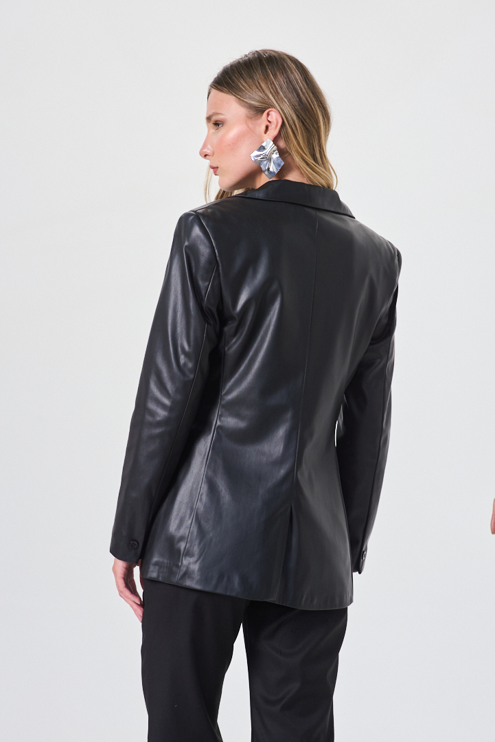 Saco de silueta oversize y estética contemporánea, confeccionado en cuero ecológico de acabado elegante y textura suave. Su diseño de un botón aporta una impronta minimal y moderna, equilibrando estructura y fluidez para lograr una prenda versátil, ideal para elevar looks urbanos con carácter y sofisticación.