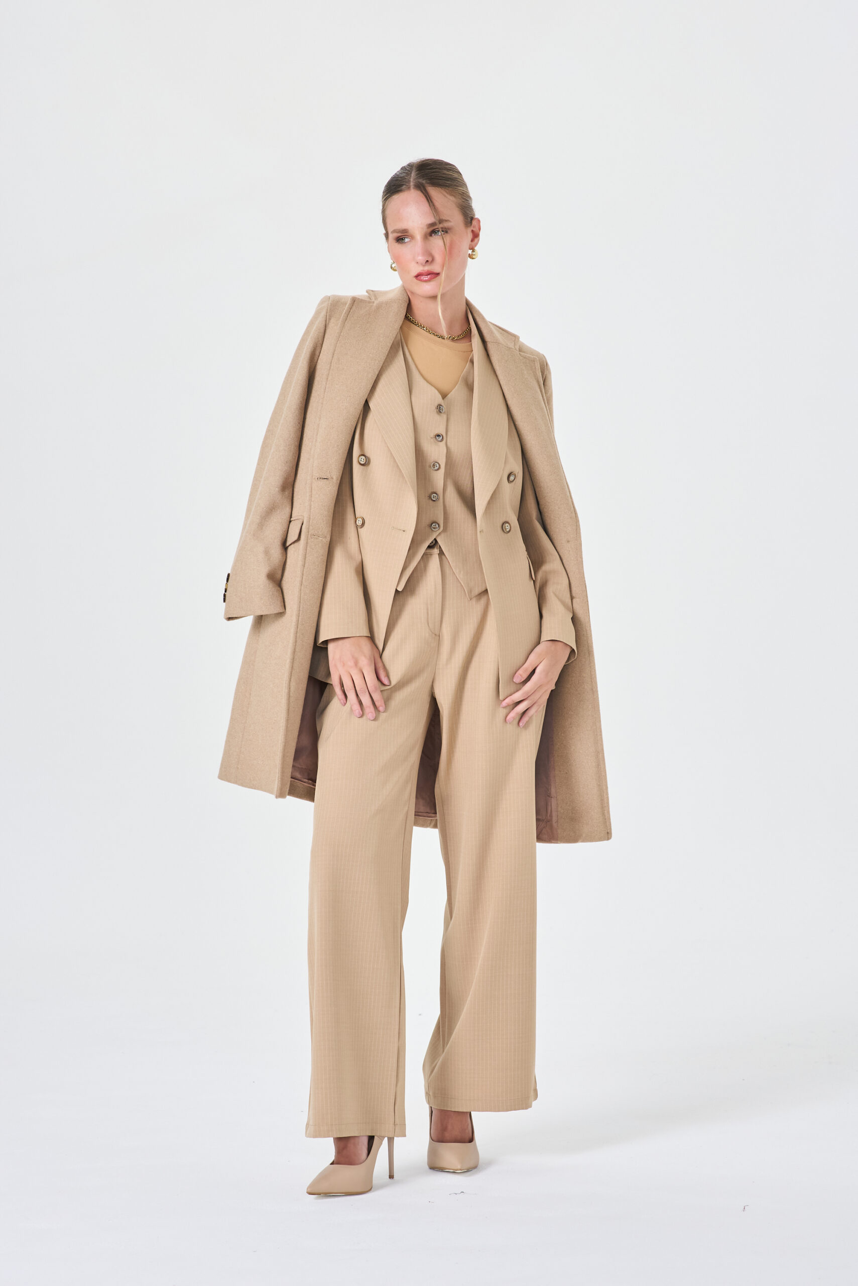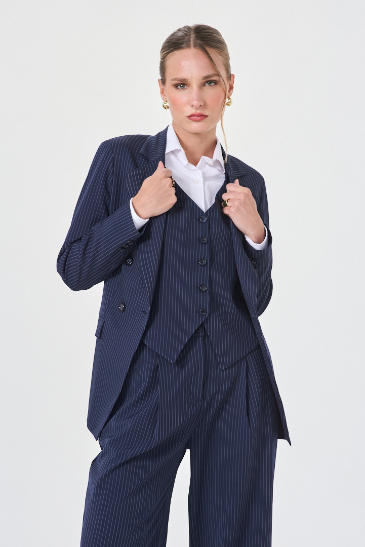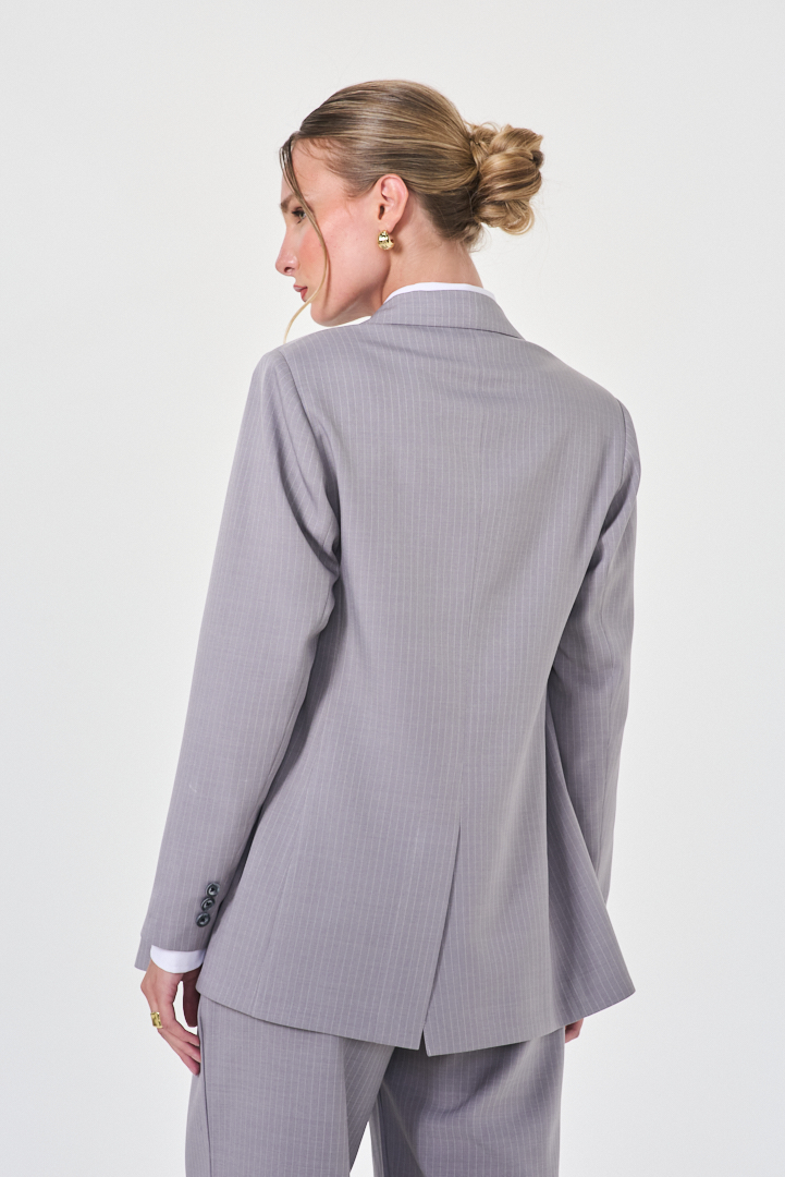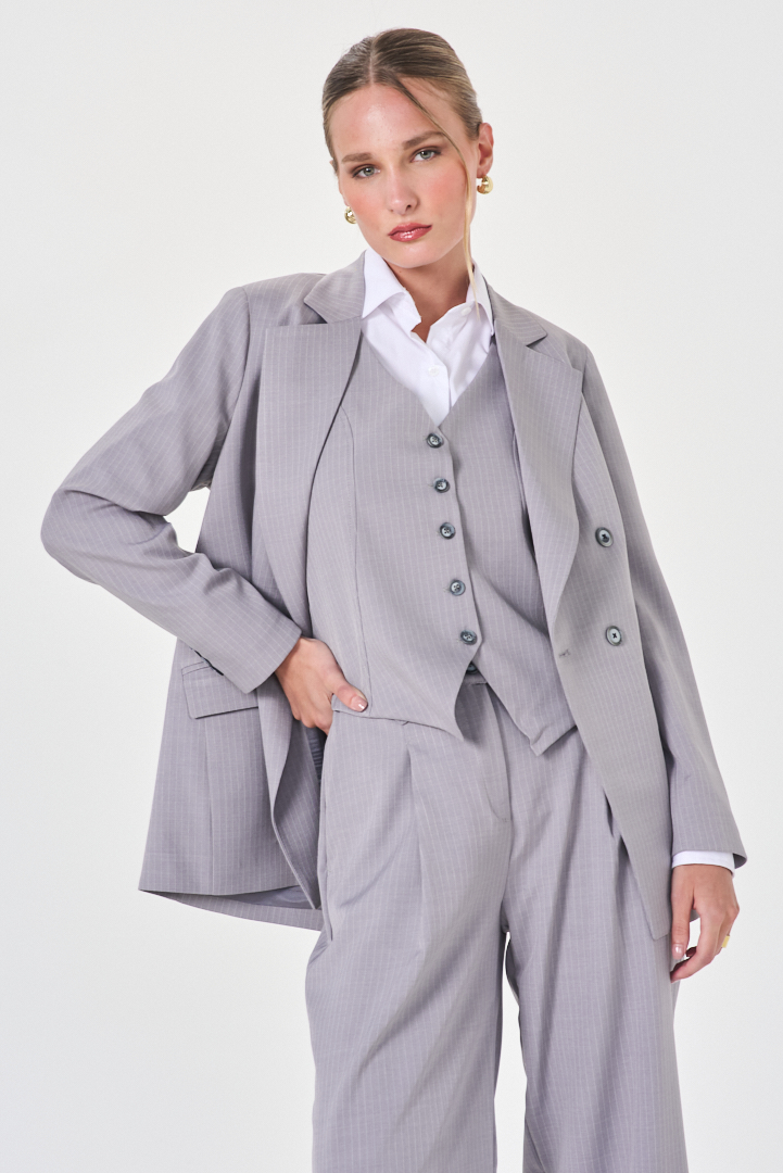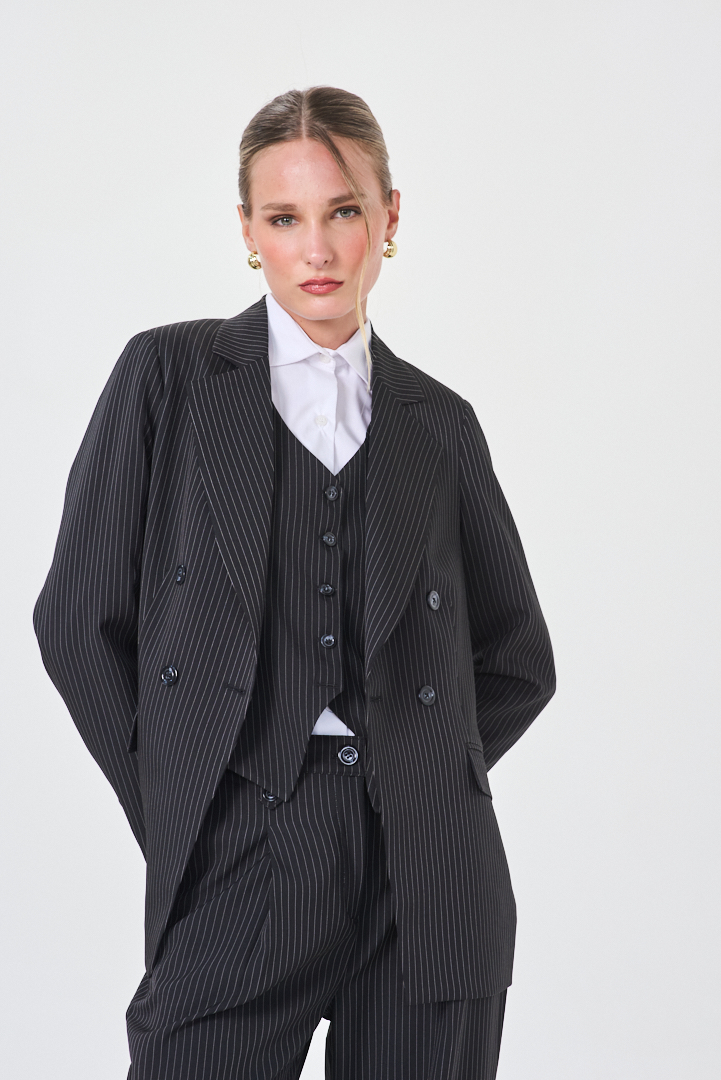 Saco de estética sastrera y diseño atemporal, confeccionado en tejido tizado que aporta textura y carácter sofisticado. Su silueta cruzada realza la estructura y define una presencia elegante, ideal para elevar looks urbanos y formales con una impronta clásica y refinada.