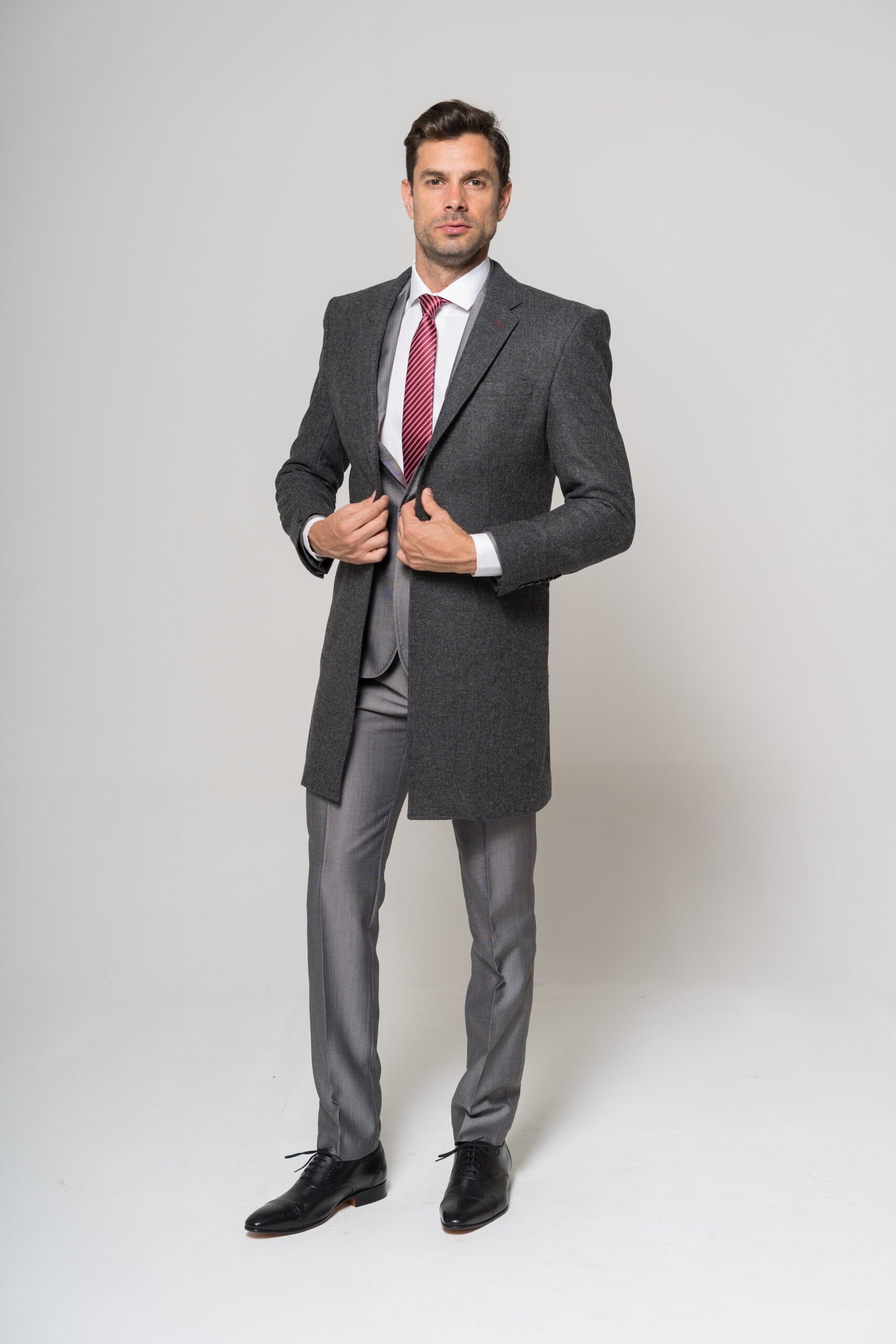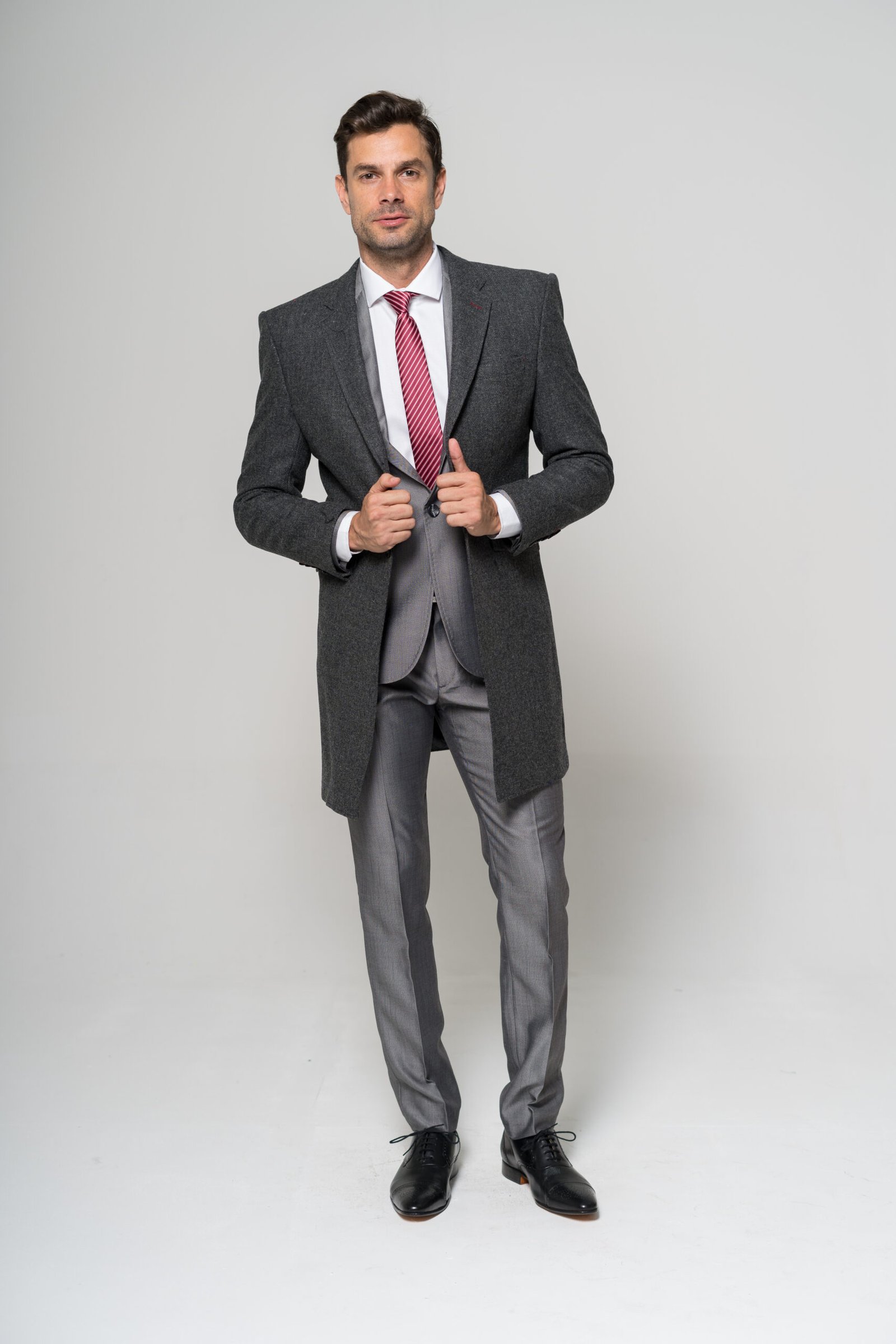 Sobretodo confeccionado en lana melange, aportando textura. Su calce slim fit define la silueta.