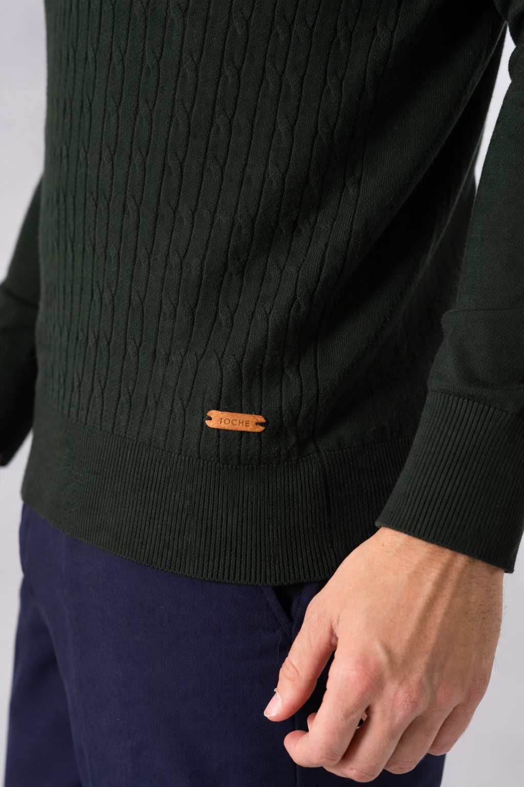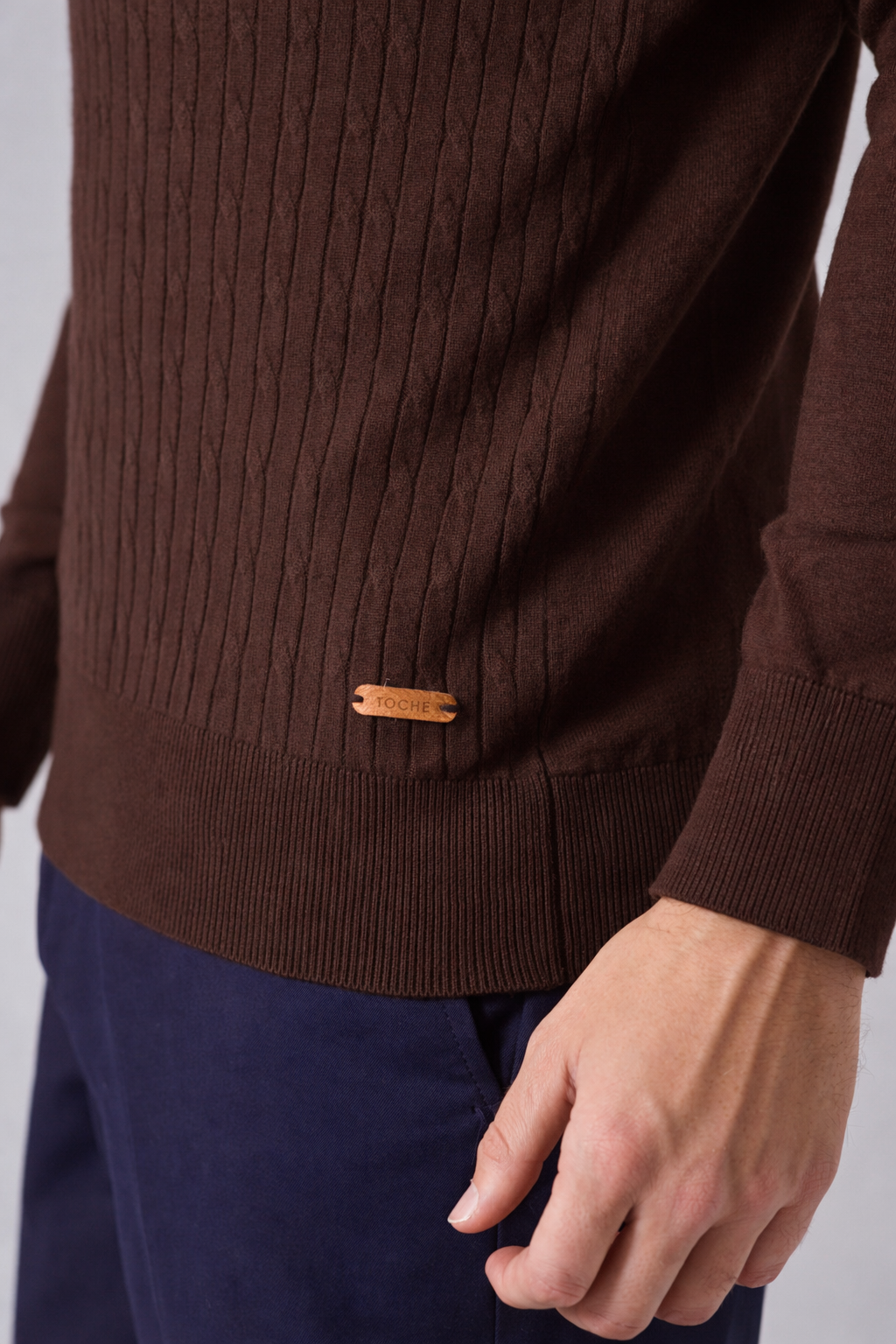 Sweater de estética atemporal y diseño sutil, confeccionado en tejido liviano con trama trenzada. El modelo mide 1,89 m y está usando talle L.