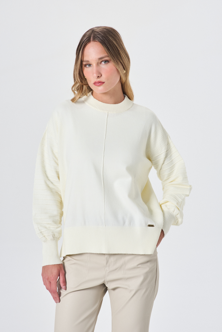 Sweater de estética contemporánea y diseño cuidado, con escote redondo y mangas anchas que aportan una silueta relajada y elegante. Incorpora alforza como detalle constructivo que suma estructura y carácter sutil, logrando una prenda equilibrada y versátil, ideal para looks urbanos refinados con impronta atemporal.