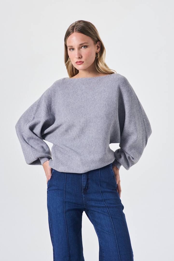 Sweater de diseño contemporáneo y estética sofisticada, con escote bote y mangas murciélago que aportan movimiento y una silueta relajada y elegante. Su caída fluida y líneas depuradas lo convierten en una prenda distintiva, ideal para looks urbanos refinados con un aire moderno y atemporal.