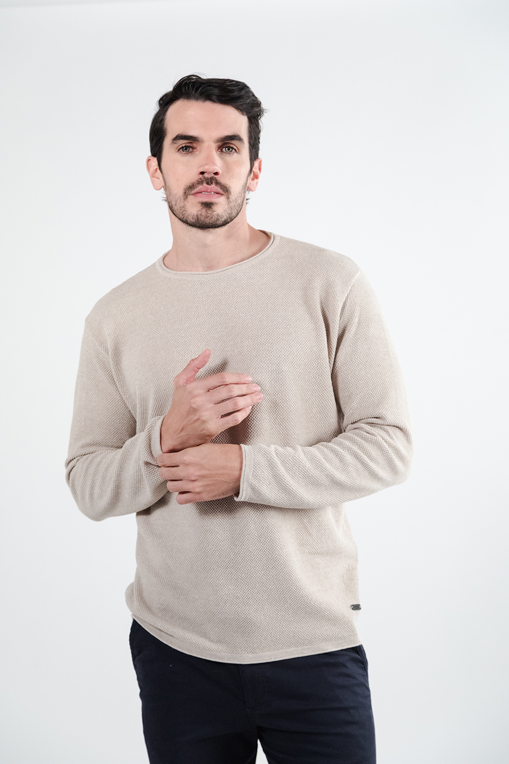 Sweater confeccionado en punto texturizado, que aporta relieve sutil y una estética sofisticada. Su cuello redondo y caída prolija definen una silueta moderna y versátil.