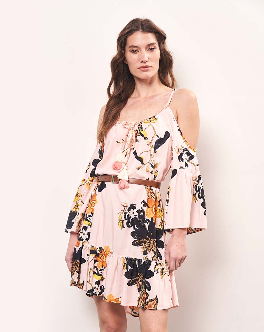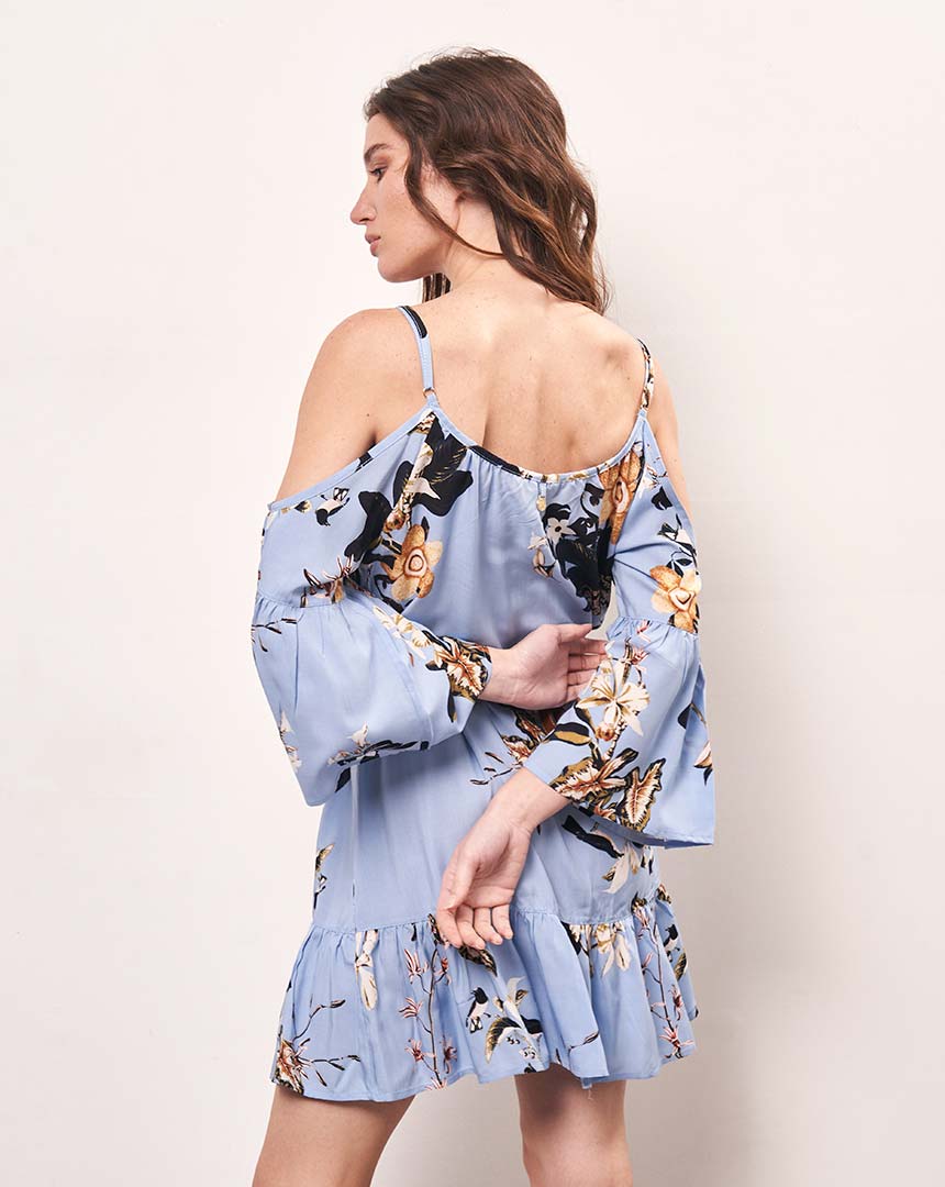 Vestido corto Flora de fibrana con mangas y hombros descubiertos
